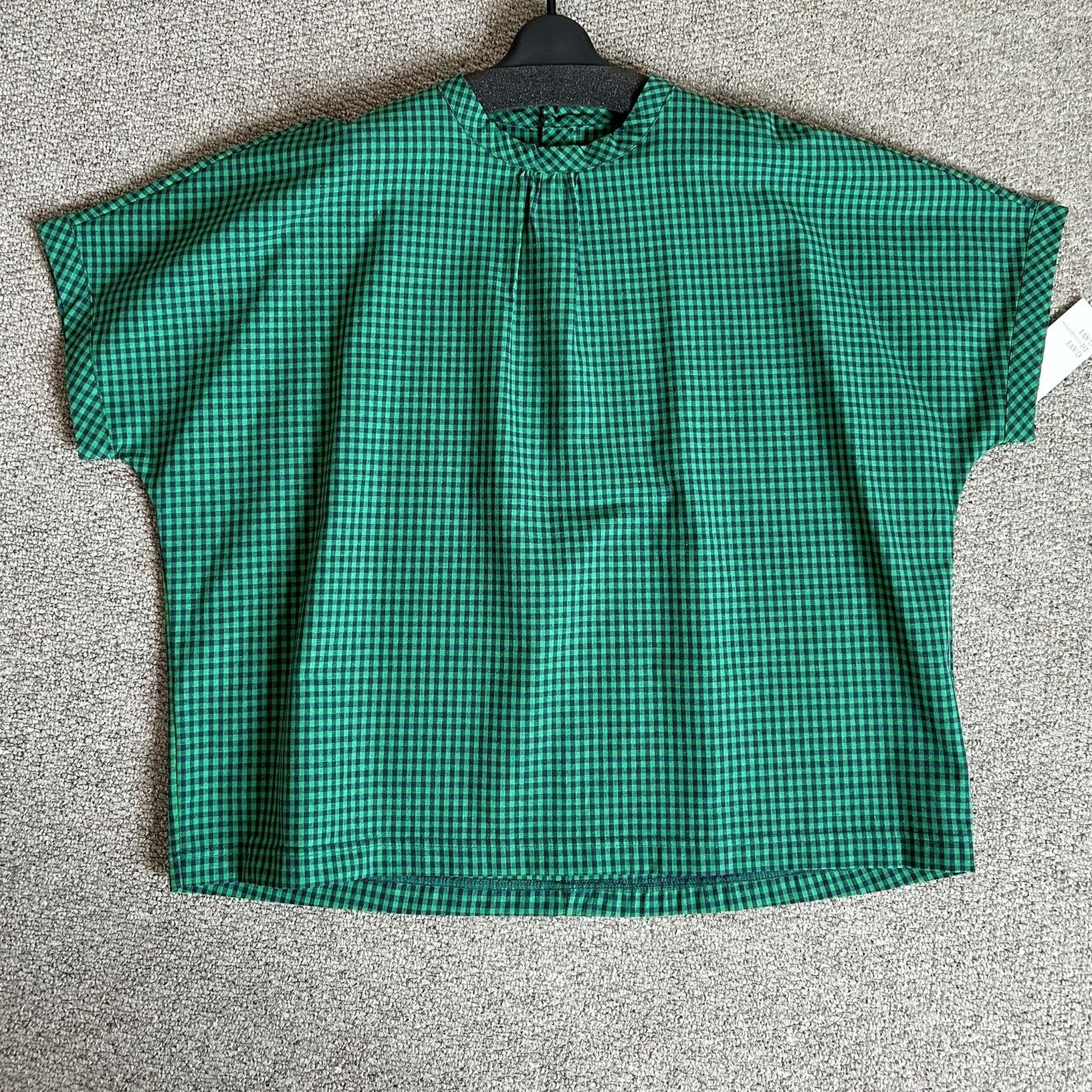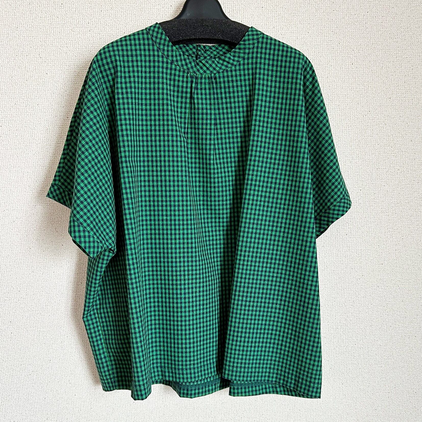 グリーンチェックのボックスシルエットシャツ、クルーネックデザイン。